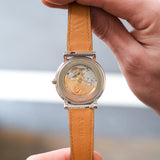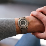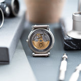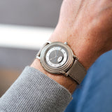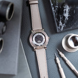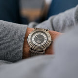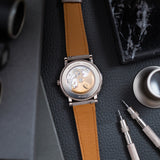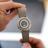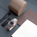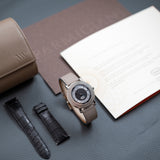 This Parmigiani Fleurier Toric Automatic is sold together with its original strap, white gold buckle, blank papers, and a Mr Watchley travel case. The watch is paired with a Mr Watchley Grained Light Grey strap.