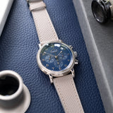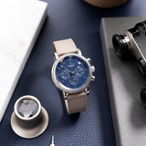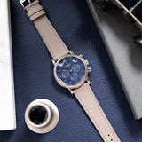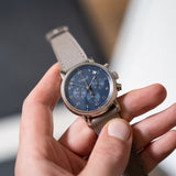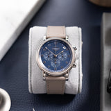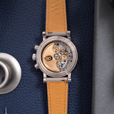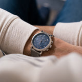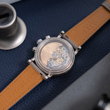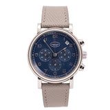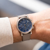 Presenting in a deep blue abyss colour, the dial directs the personality of the entire piece with its youthful and casual tone, a feeling further enhanced by the applied white gold numerals. Said numerals are Breguet in style with a softer, more casual execution than other Breguet numerals. This font is mirrored within the instantly identifiable and somewhat quirky 1:30 white date aperture. Also presented in white gold are the hands of this piece, including the elegant solid javelin hour and minute hands, chronograph hand with crescent moon-shaped counterbalance, and three-needle subsidiary register hands within their tri-compax layout. Notably, the hour and minute hand carry a satin grey finish for additional contrast from the remaining polishing. The minute graduation scale on the peripheral rehaut is subtly grained in texture, which, when combined with the concentric circles of the sub-registers, contributes significantly to the dial's legibility. A horizontal oval white gold ring houses the Parmigiani Fleurier brand signature completing this bold, clean, and clarity-rich chronograph from a neo-vintage watchmaker who is starting to gain the attention with its earlier models it certainly deserves.
