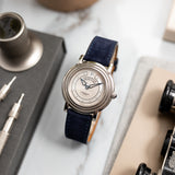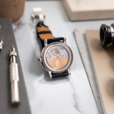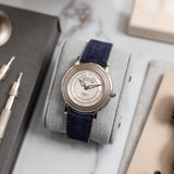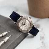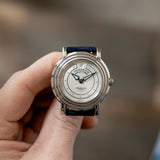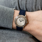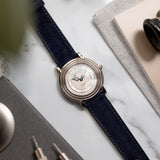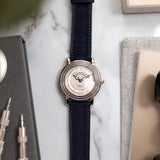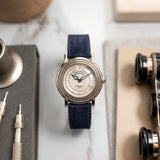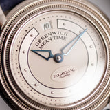 The PF004579 Memory Time demonstrates Parmigiani Fleurier's penchant for blending ancestral and contemporary watchmaking techniques, showcasing traditionally considered elements yet incorporating proprietary styling and a multitude of subtleties. Exceedingly characterful in its 18ct white gold 36mm case, this golden ratio-inspired exterior is defined by its double-stepped coin edge bezel, which draws upon Greek and Roman "Doric" columns. This striking hand-finished exterior includes welded lugs, providing a comprehensively formed case of distinction and grace. The idiosyncratic lavishness outlined by the case translates effortlessly to its dial, where the classic executions continue, and modern embellishments can be found.