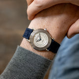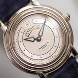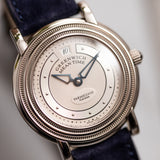 The sense of reoccurring round elements is striking with the PF004579 from both micro and macro perspectives, with the silvered dial accentuating this form first outlined by its doubled bezel. Concentric circled guilloché, a brushed silver chapter ring, an oval ring brand signature, and even its white gold polished plot hour markers paired with a dotted outer track. This symmetrical guided implementation is overwhelmingly exhaustive. The brushed silver ring is finished with a dark surround to contrast the tonal matching dial while mirroring its heat-blued skeletonised delta handset. As its 'Greenwich Mean Time' typography suggests, despite its dressy and humble nature, the aperture housed at twelve isn't a date complication but rather a jump hour second timezone display, complete with a stylised cursive font. Therefore, despite its two-hander configuration, the Memory Time has stylish travelling capabilities due to the significance of the jump hour display. Hand-finished independent watchmaking excels with this seldom-seen travel piece that's wonderfully crafted for the purist collector seeking a watch with unusual charisma and plenty of character.