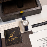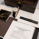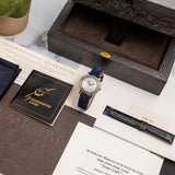 This Parmigiani Fleurier Toric GMT Memory Time PF004579 in White Gold is presented in a complete manner, with its outer box, wooden Parmigiani Fleurier box, original papers and manual. The watch also comes with a white gold Parmigiani folding buckle. Furthermore, a brand new and unworn new Parmigiani Fleurier strap is included, with a branded cloth and a white gold Parmigiani Fleurier folding buckle. Dating from 2005, this timepiece is presented in a like new condition, having never been polished and remaining barely worn. The watch is fitted to a Mr WATCHLEY Nubuck Navy Blue strap.