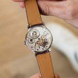 Coyon is a complete watchmaker, having first conceptualised and created the calibre 1900 in a year and a half. Guided by the appearance of pocket watch calibres, all movement finishing and assembly is completed in his workshop, with the assistance of CNC being used for plates and bridges.