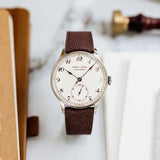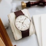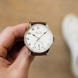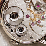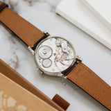 One of the many ways Pascal Coyon stands out from other independent watchmakers is how every piece produced is completed as a piece unique, meaning every piece within the Series 2 can look totally different to the next. In the case of this example, a fantastic eggshell cream dial produced from enamel houses oversized Breguet numerals, which are also rendered in 18ct white gold. The dial enamel dial took eight attempts to ensure the correct colour shade was achieved, which was important, not least because of the red printing used throughout the railroad track, brand signature, subsidiary seconds track at six, and the 'FAB EN FRANCE' font at the bottom of the dial. However, one of the lasting impressions of this piece is its handset, a completely bespoke, handmade set of sword hands, complete in a colour-changing brown hue.