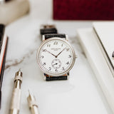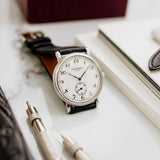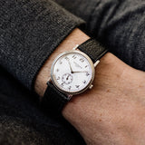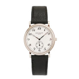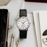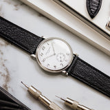 While the proportions are crucial in the visual and physical success of the 5022P, the dial of this example elevates the watch to even loftier heights. Other examples of this reference include some factors with its dial, highlighting its age, but this piece is the opposite. It all begins with the crisp, sharp white dial, which is paired with printed black Breguet numerals, a railroad track and matching black Breguet-style hands. Combined with the subsidiary seconds register at six, also with a railroad, Arabic numerals, and a black hand, this lineup of elements makes for a monochromatic appearance which is rooted in tradition yet, in execution, feels fresh and a little different.