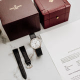 This Patek Philippe 5022P is presented in unpolished, fantastic condition still maintaining deep hallmarks and is sold with its original box, original platinum pin buckle, and an insurance document from Patek Philippe confirming the original matching numbers of the piece.