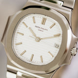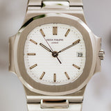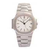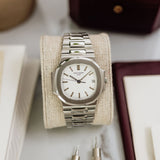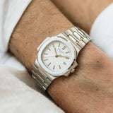 Paired with applied white gold indices and delicate luminous baton hands, this white dial has a contemporary feel without straying from the Nautilus DNA. The horizontal grooves remain, offering texture and depth, while the colour matched date at three o'clock is both practical and understated. It’s a colourway that rarely appears and even more rarely survives in such sharp, well-preserved form.