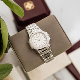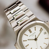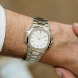 In an era where proportions are returning to classic norms and collectors value wearability just as much as collectibility, the 3800 stands out, not by being loud, but by doing everything quietly, and just right. This 3800 is fitted with a rarer white dial, a configuration that gives this mid-sized Nautilus a different appearance on the wrist.