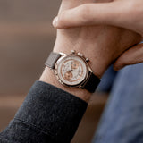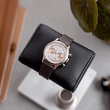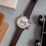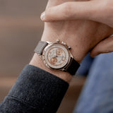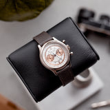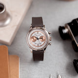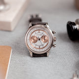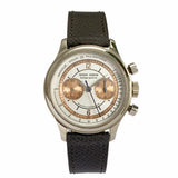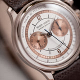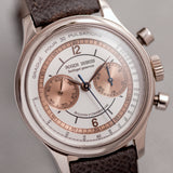 The outer track and the sub-dials are finished in a beautiful salmon colour. This bi-compax chronograph also features a pulsation scale surrounding the silver toned dial where a sector design draws all of these wonderful aspects together. The chronograph and minute sub-dial hands are blued. While the hour, minute, and seconds feuilles-shaped hands are finished in silver.