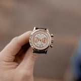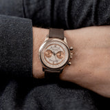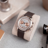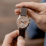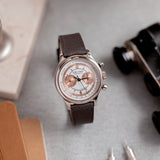 The Roger Dubuis Hommage Chronograph H37 Salmon Sector dial has a distinct greyish white gold case with a polished finish on the concave white gold bezel and on the white gold lugs, the case sides spot a satin finish. Measuring up to its vintage standard, the 37mm case watch makes a larger impression on the wrist than would be expected, due to its smart body structure.