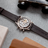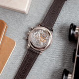 Through the engraved sapphire case-back this mighty impressive movement can be enjoyed in all its mechanical beauty.