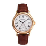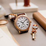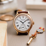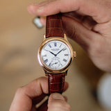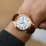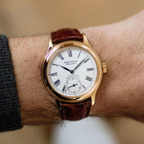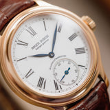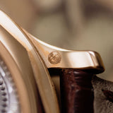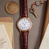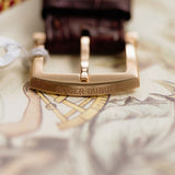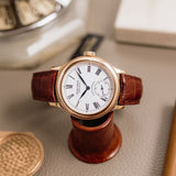 Rendered in 18k rose gold, the appropriately proportioned case is extremely classically designed, with numerous nods to models from Dubuis' past. At 40mm, this Condottieri may sound large, but its size is to house a highly reworked 1940s pocket watch movement which achieved Geneva Seal specification. Nevertheless, the case of the piece is incredibly classic with a sense of balance and is paired with a prominent crown.