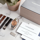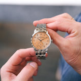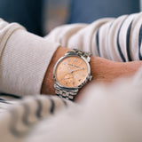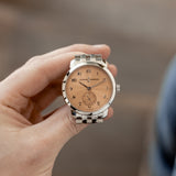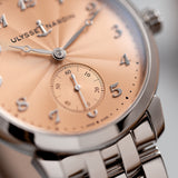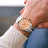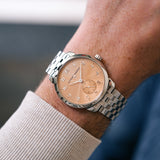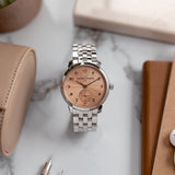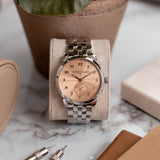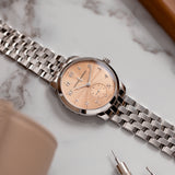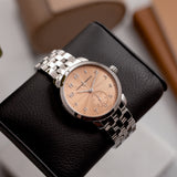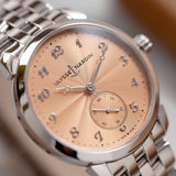 The Classico, as the name implies, wears with just wonderful ease and simply excellent style. The Classico Hour Glass edition is an exceptionally elegant dress watch that blends effortlessly with the wrist and is eye-catching in a very chic and subtle way. The combination of the warm tone of the salmon dial with the cool steel case gives the watch great versatility, which is further enhanced by the not one but three original straps included with the watch. A steel bracelet, which creates a particularly striking look, as well as one black and one brown crocodile leather strap.