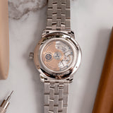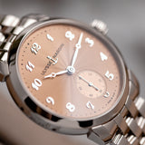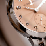 This combination of polished steel case, guilloché salmon dial and mirrored Breguet numerals/hands creates simply the most beautiful interaction between the watch and light. From any angle, the watch glistens, the salmon dial taking on an almost ethereal appearance in bright, natural light, whilst in darker light the more golden hue of the salmon dial shines through.