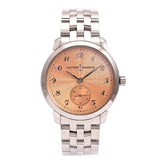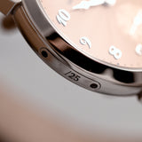 The round case is formed of polished, shimmering steel and measures a neat 40 mm in diameter whilst sitting at 10 mm high. Refined, subtly curved lugs gently extend from the all-encompassing case that serves as the perfect portal to the openly magnificent dial. A salmon dial beautifully covered in sweeping, radiating guilloché, undeniably an aspect of interest to collectors, yet not at all the only feature that makes this a real stand-out, stand-alone piece. Raised, mirror polished Breguet numerals mark the hours, perfectly matching with the mirrored Breguet hands that grace the dial.