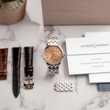 Two further, seemingly small yet decidedly significant, design choices complete the excellently executed dial. A seconds subdial is located at 6, yet the date function normally found here on the Classico is absent. For this limited edition piece, The Hour Glass Japan explained the decision was made to remove the date window for a "simpler and more elegant design". In keeping with this idea of streamlining the dial, the 'swiss made' below the 6 was flawlessly incorporated into the circular flow of minute markers on the outer perimeter of the dial. Small touches that make the world of difference.