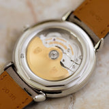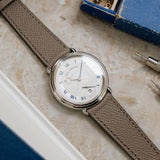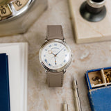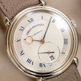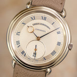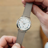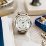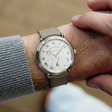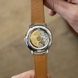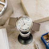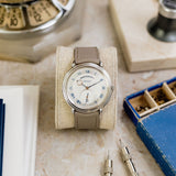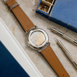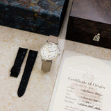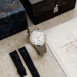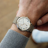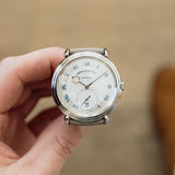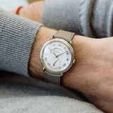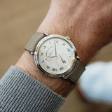 This Urban Jürgensen Big 8 is offered today as a complete set, including its original box, papers, and stainless steel pin buckle. The watch is presented in fantastic condition carry only minor hairline scratches. The watch is fitted to a Mr Watchley Light Grey Grain strap.