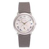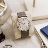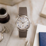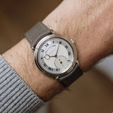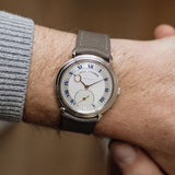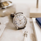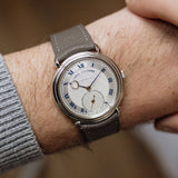 Texture is brought to the silver dial through varying forms of hand-finished, engine-turned guilloché which is seen in the centre of the seconds sub-dial and across the main part of the dial. The brushed hour chapter ring is completed with blue inked Roman numerals and is slightly separated from the outer ring of blue minute markers, the ring of markers on the seconds the sub-dial following the exact same pattern.