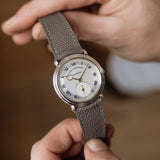 Each of the teardrop lugs that embellish the case are individually created, heat-treated, hand-polished and then fused onto the case using a technique that has been in use since the mid-twentieth century. This faithfulness to traditional watchmaking techniques stems in part from the influence of Derek Pratt, who resisted modern developments within watchmaking.