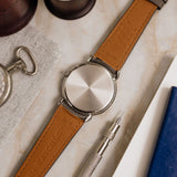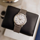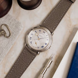 The watch is powered by the automatic Caliber 1160, an ultra-thin movement that is produced by Frédéric Piguet. It contains 30 jewels, has a power reserve of 100 hours and a frequency of 21,600 A/h. While the movement may not be in-house in construction, it has been adorned with Urban Jürgensen's attentive in-house curation. The movement is covered by a platinum closed caseback, indicating it is one of the first Reference 8 pieces to have ben made, later version would have the see-through sapphire glass exhibition caseback. Another indication it is an early version, it's it movement number, 8-00XX, one of the first 10 to have been made. Geneva stripes and anglage can be seen on the bridges, while the 21K yellow gold rotor is almost completely covered in very delicate guilloché and is neatly completed with the UJS crest.