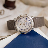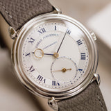 This refined timepiece is in great unpolished condition, with normal signs of wear. This rare and unique reference 8 hails from one of the most noteworthy moments within the Urban Jürgensen archive, comes with its original platinum pin buckle.