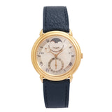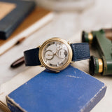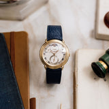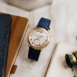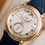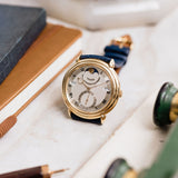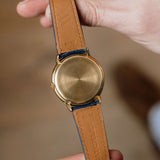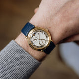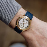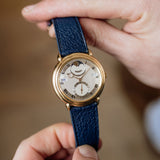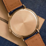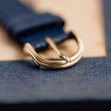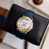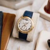 This Urban Jürgensen Reference 2 in yellow gold is complete with its original pin buckle, original alligator strap, and certificate of authenticity signed by Kari Voutilainen. The watch is in very good condition and fitted to a custom Mr Watchley Strap in Blue.