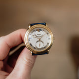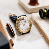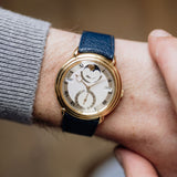 While the watch world patiently waits to discover what an Urban Jürgensen looks like under Kari Voutilainen's leadership, pieces such as this rare Reference 2 have been declared to be the vision for this brand's grand return. Well, we say rare, but with only 175 examples of the model ever produced, that is somewhat a given for this traditional yet individual perpetual calendar. Rendered in 18k yellow gold, the 38mm case may be straightforwardly formed, but its presence is striking. A generously stepped bezel and petite teardrop soldered lugs contribute directly to its svelte profile and overall charm. This is an early instance of these key design cues, which still can be found in modern Urban Jürgensen creations.
