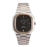 A cohesive continuation of the theme outlined by the case is found behind the crystal of this 2215. Replicating the vertical brushing mentioned previously, the brushed matt slate sigma dial of this piece blends into the whole watch effortlessly. Raised white gold hour markers are present throughout the watch varying in size and visual weight. The three and nine feature a long, thin, baton respectively, whereas the twelve doubles up those batons. Curiously, the rest of the markers are less than half the length and sit ever so slightly more central to the dial. A date aperture is present at six with a brushing texture to the window. Thin, baton-like white gold hands finished with lines of white to match the markers display the hours and minutes, as a seconds hand with large counterbalance sweeps over this mid-70s timepiece. As the text towards the lower half of the dial suggests, this piece is powered by a chronometer grade movement meeting the exacting standards outlined by Vacheron Constantin.