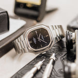 Released at the inaugural period for luxurious takes on sports watches, this Vacheron Constantin Chronometre Royal 2215 is presented in superb condition from its clean case bevelling to each individual vertically brushed bracelet link. Right off the bat, the 2215 is here to make a statement with its elongated octagonal case shape characterised by its seemingly never-ending vertical sides and short but sweet scalloped corners. Eye-catching bevelling offsets the beautifully defined vertical brushing throughout the case; a finish that seamlessly extends to its integrated steel bracelet. Comprised of a three-link design, the 2215’s bracelet subtly tapers down to the brand’s Maltese cross-signed original folding clasp. Adding further emphasis to the quality of the external bevelling is its matching bezel complete in a high polish. Firmly set within the parameters of the case, this stepped concave bezel mirrors the overall shape of the watch whilst simultaneously reducing the perceived appearance of all the steel.