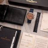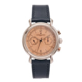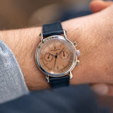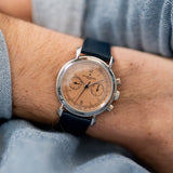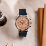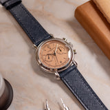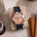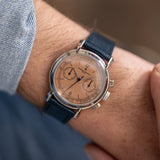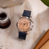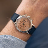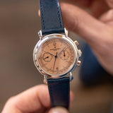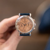 One of the more nuanced and less discussed of the three is Vacheron Constantin. It's seen as the thinking collector's choice, and right on the cusp of the nineties, they called upon the Lemania 2310 – an ébauche calibre famed for its widespread adoption by many top manufacturers – to power their latest creation, the Les Historiques ref. 47101. As its series name suggests, the Historiques collection was established to honour noteworthy pieces from their archive. In the case of the 47101, Vacheron recalled the 1940s and the 4178, wildly regarded as one of the most stunning chronographs, full stop. Tear-drop lugs, metal hands, a tachymeter scale, rectangular pushers, and a mix of baton/Arabic numerals make this twin register mid-sized chronograph the supreme expression of classically inspired grace. The series includes the 47101 and the 47111, which share most attributes, only carrying minor adjustments such as a screw caseback and a slightly updated movement. During its lifespan, yellow gold was the most prevalent metal, yet there was also a small run of platinum-cased examples. Dials were produced in a variety of colours, from off-white, black, and the coverted salmon. It is thought only 300 platinum watches were assembled, with the majority fitted with silver dials, around 60 for the salmon and just 25 for a limited edition run of black dials aimed at the Japanese market.