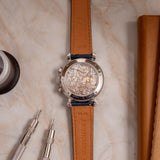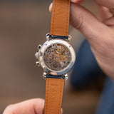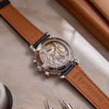 Powering this piece is the Vacheron cal. 1140, a thoroughly hand-finished evolution of the Lemania 2310. This nickel-finished movement comes with 21 jewels, a self-compensating Breguet spring, a swan-neck regulator and is adjusted to 5 positions. Enjoy the chamfering and finishing in all its beauty through the sapphire display screwed case back.