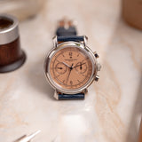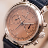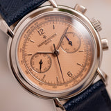 Few case and dial combinations are as sophisticated as a white metal with a salmon dial. A beautiful fusion of unassuming versatility and bewitching allure, the humble salmon has been a favourite of discerning collectors for as long as watches have been on people's wrists (in fact, in pockets as well). They offer a rose-tinted view of timekeeping, and when the pinkish dial hue is adorned with a Vacheron Constantin signature, rest assured bundles of charm are also on the menu. Bursting with retro-vintage character and enduring refinement, the Vacheron Constantin Les Historiques 47111 is one of the personality-rich greats. This example dates from 2000 and is rendered in platinum.