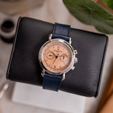 Some refer to the dial configuration of this 47111/000P as one of the most beautifully designed dials ever produced, and I'm not about to challenge that. This engine-turned sigma dial cuts zero corners, with its twin registers, baton markers, and oxidised hands conveying pure class. The mid-century inspiration is inescapable, from the subtle railroad tachymeter scale to the leaf hands for the sub-registers. And how about that hue? Frequently dials referred to as salmon possess more dominant pink tones, often featuring sectoring or two tones, but this is a true salmon. Hints of warming orange and peach exemplify elegance when married with the depth of the vertical wave guilloché. There are two influential elements of impactful contrast to observe here, first occurs because of the paused engine turning for the sub-registers and tachymeter scale, and the second is the black printing throughout; a decisive design intention which contextualises and elevates the entire chicness of the piece immeasurably. In a similar vein is the presence of the applied Arabic twelve and six markers. As the registers deliver horizontal symmetry, these key elements ensure the balance continues vertically, re-iterating the holistic attention to detail of this modest platinum Vacheron.