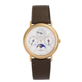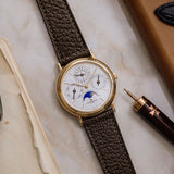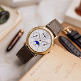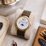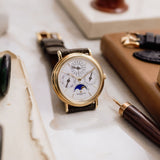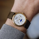 Exemplifying classical aesthetics, the timepiece boasts a polished case with a stepped bezel and straight lugs, echoing the brand’s rich heritage, especially its legendary perpetual calendar pocket watches with a 48-month cycle. Despite its nod to tradition, the watch's slim profile, measuring under 8 mm, embraces contemporary design sensibilities, ensuring a comfortable wearing experience.