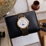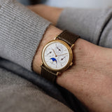 Highlighted by a moonphase crafted from lapis lazuli, along with indicators for the weekday, month, leap year, and date, the dial creates a mesmerising sense of depth, particularly under the play of light. The white backdrop, complemented by gold hour and minute hands, hosts sub-dial hands in a contrasting dark grey/black hue.