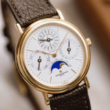 The Vacheron Constantin Perpetual Calendar, Ref. 43031 embodies the epitome of a refined dress watch, showcasing unparalleled horological sophistication and elegance. Crafted from 36 mm of lustrous yellow gold, this timepiece distinguishes itself with its immaculate white dial adorned with a "Automatic" inscription and a golden Maltese Cross.