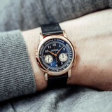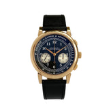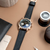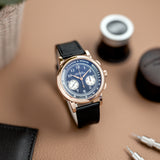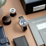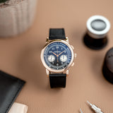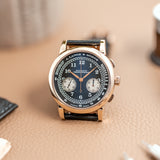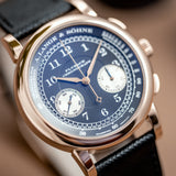 This is only further enhanced by the black oxidized silver dial with sterling silvered sub-dials (each offering a unique railway-track scale), creating a contrasting design and offering perfect legibility. The dial features 18-carat rose gold luminescent alpha-style hour and minute hands, a counter weighted needle style second hand, small, blued hands for the chronograph 30-minute totalizer (4 o’clock) and seconds register (at 8 o’clock) and is painted white Arabic numeral hour markers – a hallmark for the 1815-series.