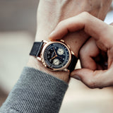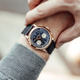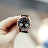 But the most distinctive design element of this delightful timepiece is the peripheral, railway-track minute scale with an outboard pulsation scale for taking pulses in conjunction with the chronograph. The dial furthermore offers a remarkable perception of depth, created by showcasing different levels: the flange, the hour-track and separate sub-dials that are sunk into the dial. Despite having a robust feel, the watch wears comfortably due to its polished curved lugs.
