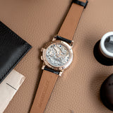 The refined hand-finishing of the German watchmaker is reflected in the vintage inspired pushers, branded crown, signed case, dial and 18-carat pink gold A. Lange & Söhne pin buckle and signed movement.
