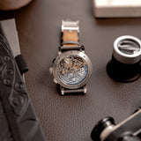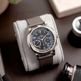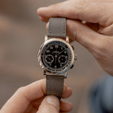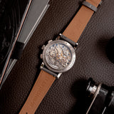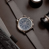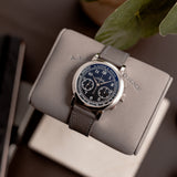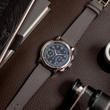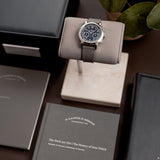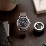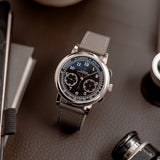 This 2020 1815 Chronograph 414.028 comes complete as a full set example. The watch is presented in like-new condition with only honest, small hairline scratches. In addition, the watch has been paired with an incredibly supple Mr Watchley Grained Light Grey strap. The original Lange & Söhne Black alligator strap is new, unworn and included in the set. (The Watch Stand in the pictures is not included)