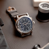 Often referred to as the little brother of the Datograph, the 1815 Chronograph is the perfect intersection of haute horology meets realistic, daily usability. The example seen here dates from 2020 and represents an exceptional example of the 414.028 which was first introduced in 2017. Encased in stealthy white gold, this 39.5mm wide watch features signature notched lugs complete in a polished finish with accompanying bevelling and a gentle downturn. The case is skillfully constructed with an overriding air of simplicity. Gracefully squared off chronograph pushers occupy the right-hand side of the case with its suitably sized, easy to operate crown to match. A rounded bezel design directly plays into the hands of wearability and dynamism, setting the stage with ease for the striking dial.