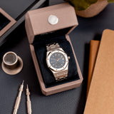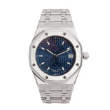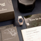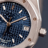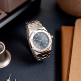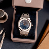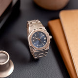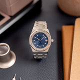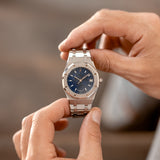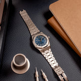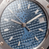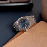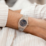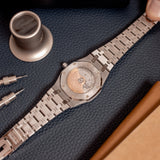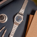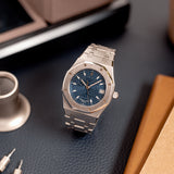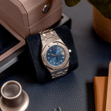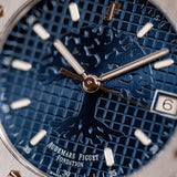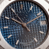 The distinctive blue dial of this reference with its oak motif has rarity and beauty as credentials creating a distinct presence on the wrist. The symbolism of the oak tree is profound on the wrist and tastefully integrated without compromise. Measuring 36mm in width, you may be forgiven for assuming this Royal Oak is small, dainty, and lacking in wrist presence. The reality is, in fact, quite the opposite. Of course, it does take up a smaller amount of wrist real estate than the more prominent 'Jumbo', but its measurement on paper doesn't tell the whole story. The additional bonus of this piece is that no matter where you go, if the conversation turns to watches, you'll always have a fascinating, public-spirited topic of discussion.