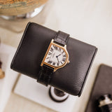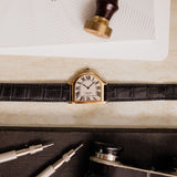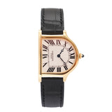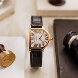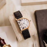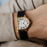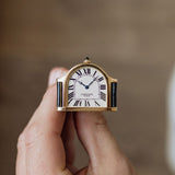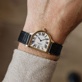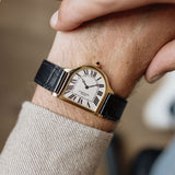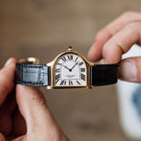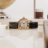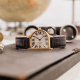 The Cloche is a relative rarity within the Cartier catalogue, making appearances throughout the years since its creation in the 1920s but always in limited numbers. A small number of models were fashioned between 1920 and 1970, while the 1980s saw a flurry of aesthetically creative quartz models as part of the Louis Cartier collection. A small but significant design change would take place with the next version launched in 1995. The two-hundred-piece, limited production run in yellow gold would be created with a brushed 6 ‘o’ clock side, adding a new dimension to the Cloche. No longer just a wristwatch but now also created with the option of being used as a desk clock. A Cartier model in continual evolution.