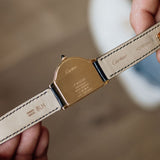 Measuring 28,8mm x 37,2mm, and sitting at 6.1mm in height, Cartier increased the original measurements of the 1920s Cloche by around 15% for this unique CPCP version. All 100 pieces of this limited-edition production were fashioned exclusively from yellow gold. The look and feel of the case devotedly recall the original, complete with its sapphire capped, beaded crown, which is exceptionally placed at the 12. The phenomenal form of the Cloche has simply been brought into slightly sharper focus by the hand of modern watchmaking. Every surface of the case is polished apart from the base of the case and the signed caseback, which are brushed. The caseback, held in place by four screws discreetly placed near each of the four lugs, does have a polished lip and displays all expected hallmarks, together with the piece's reference number as well as its limited-edition piece number, engraved just below the centre of the caseback.
