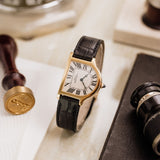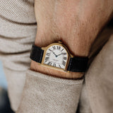 It would be a year later though when the real twist would come. The Cloche form made conventional sense for being able to tell the time for a watch-brooch. Yet this was the debut of Les Années Folles (the Roaring Twenties) and there was little appetite for convention. Quite the opposite. It was a time to be radical - and fabulous. Cartier switched perspective and made La Cloche into a platinum and diamond wristwatch, followed by a yellow gold version with leather strap in 1922. A sure-fire hit with the new, sharply dressed personalities of the slightly eccentric and rather eclectic café society scene.