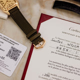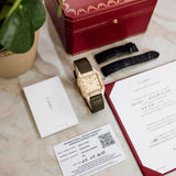 This Cartier Santos Dumont Lacquer is presented in unworn, new condition and is complete as a full set. Dating from 2022, the piece is paired with a smooth Boxed Green Mr WATCHLEY strap, including its original strap and 18k rose gold pin buckle.