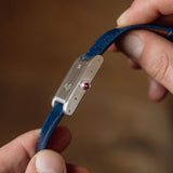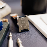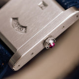 Although unmistakably a Tank, the form of the Tank à Guichets is a little different from convention. The model carries a broader presence, measuring 26mm wide by 37mm, and, most notably, the brancards sit flatter and a little more squared off than a Tank Louis, with a singular polished chamfered edge. It's a predominantly brushed affair, with a vertical grain pairing wonderfully with the signficant heft of the platinum case. At a glance and without a reference point, this case material may seem like any other popular white metal. However, its ruby cabochon protruding from the octagonal crown at three is a telltale sign that this is a special Cartier in PT.