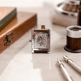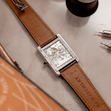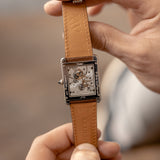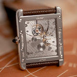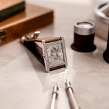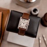 Another touch that gives this iconic and classic Cartier design its subtle modern feel is its sapphire glass caseback, through which the Cartier 9701MC calibre can be viewed. The Cartier Tank XL is one of the very few rectangular Cartier models to house a rectangular calibre. Based on the Piaget calibre 9701MC, the manual-winding movement has a 36-hour power reserve, a frequency of 21,600 vph and contains 19 jewels. The free-flowing bridges of the nickle-finished lever movement are all exquisitely engraved with the Cartier double-C cipher. The movement, as well as the caseback, are signed and on the lower edge of the caseback an engraving of the piece number is located.