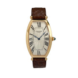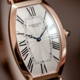 This Cartier Tonneau 2802 XL 100th Anniversary edition is in mint condition and has perfect mechanical functionality. It comes as a full set, with signature red Cartier CPCP box and the original Cartier papers. The Tonneau is fitted with a custom made Mr Watchley caramel "round scale" alligator strap and the original Cartier black alligator strap is included as well.