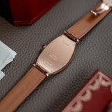 This hand-wound time-only Cartier Tonneau XL from the CPCP collection pays a ravishing tribute to its century older antecedent, with its elongated, sleek and curved case in pink gold, perfectly following the curvature of the wrist.