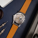 A noteworthy evolution with early 1860 references relates to their case configuration. The full initial reference number for these watches is 16/1860/1, and regardless of their case materials, featured hunter case backs. They’re believed to (but remain unconfirmed) be produced in 100 editions per configuration. Following the /1 was the 16/1860/2, which removed the hunter-style caseback in favour of a sapphire crystal display caseback; although a hunter-style caseback was still included in the watch box. The blue dial format of the 1860 was believed to only have been produced with a guilloché decoration during the production run of the 16/1860/1, until today.
